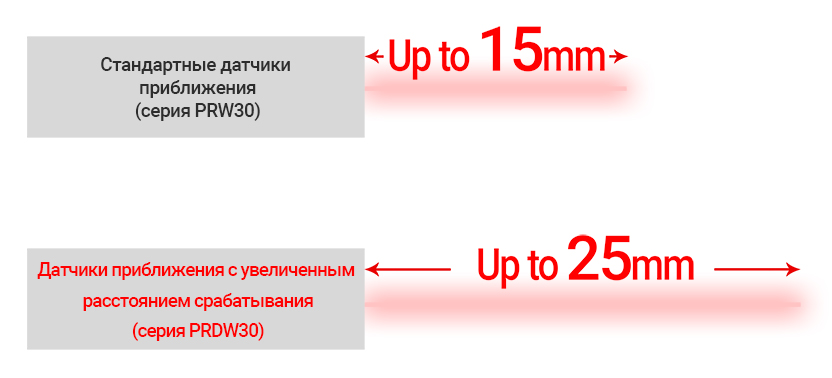 Датчики серии PRDW отличаются увеличенным расстоянием срабатывания (1,5-2-кратное увеличение) в сравнении со стандартными индуктивными датчиками Autonics серии PRW.