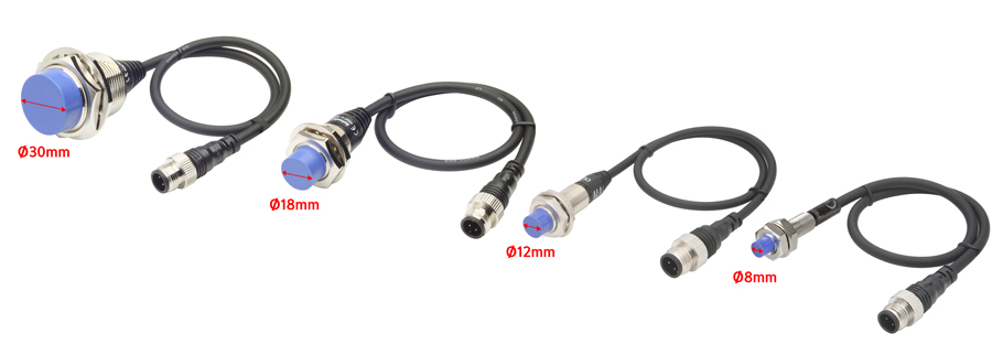 Датчики этой серии доступны в корпусах диаметром 8 мм, 12 мм, 18 мм, 30 мм. Благодаря широкому разнообразию типоразмеров эти датчики можно устанавливать в условиях ограниченного пространства, выбирая настройки, соответствующие требованиям системы.