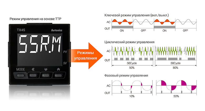 - Функции управления на базе выхода с ТТР (SSRP): стандартное управление в ключевом режиме (вкл./выкл.), циклический режим управления, фазовый режим управления